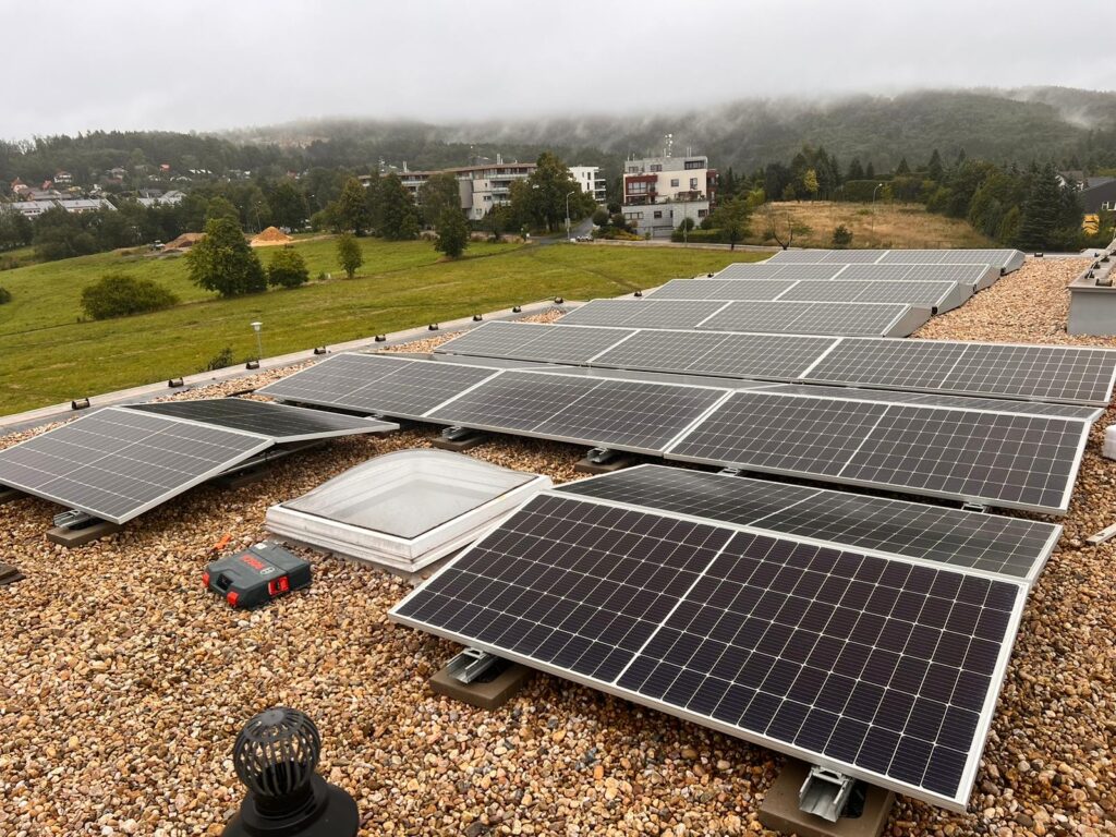 22 ks panelů o nominálním výkonu 450 Wp Panely jsou instalovány na ploché střeše