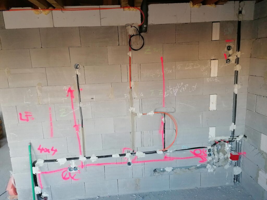 Tahání silnoproudé kabeláže (zásuvkové, světelné a výkonové okruhy), uložení do drážek, pod omítku, do podlah nebo instalačních lišt podle typu stavby a platných norem.