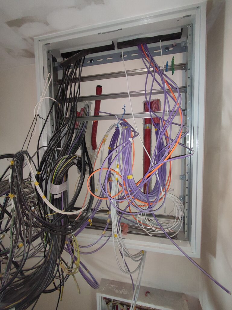 - Instalace strukturované kabeláže (LAN) – příprava rozvodů pro internet, TV a další datové služby, včetně datových zásuvek a rozvaděče pro síťové prvky.